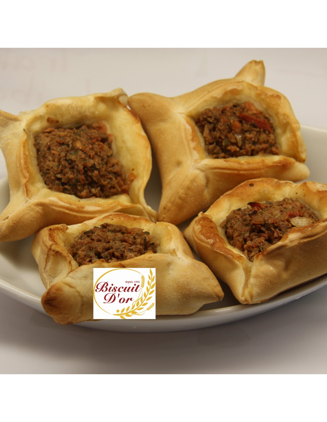 Ingrédients: farine de blé, viande de bœuf, tomate, oignon, sel ,poivre.